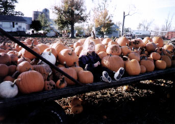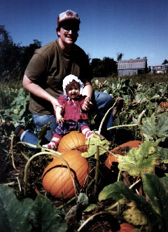 Grandpa Downing (Vernon -- Generation 3) milked cows and raised hogs and crops for many years. He is now supposedly retired, but he stays busy helping sons Bob and Dan with crops and cows. (Bob has a farm nearby, while Dave and Michele went off to grow soft with cushy city jobs.) Grandpa decided to try growing pumpkins in 1994, and I think he didn't know what he was getting himself into. As a life-long farmer, he knew how to carefully prepare the soil, plant the seeds and cultivate out the weeds. By late summer, it was evident that a nice crop of pumpkins was on the way.