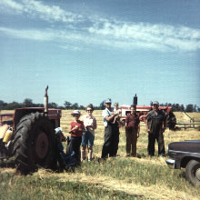 1973: During oats harvest, Dave, Diane, Vernon, Michele, Bob and Russell pause for a photo.