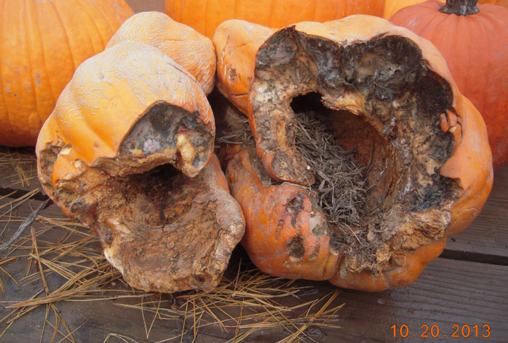 Found this fun surprise in the field in 2013. Some enterprising mice made their home in this unusual "conjoined" pumpkin. A home to keep them warm and dry, and when they were hungry, they could eat the house! See how they filled it with grass to make it cozy? We find a few of these "conjoined" pumpkins every year - two pumpkins growing out of one stem. But never one that had been turned into a rodent bed-and-breakfast!