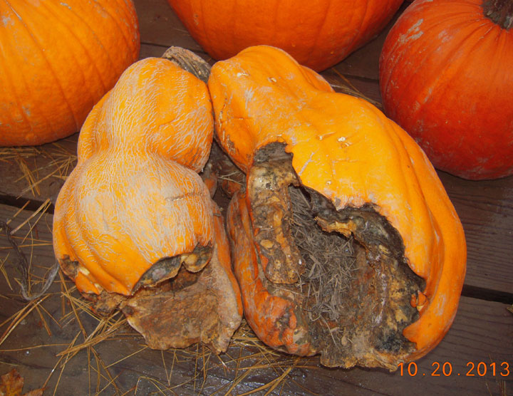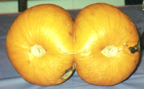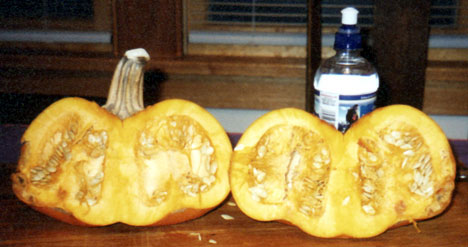 This is our "conjoined pumpkin." Don't know how it came to be, but it grew this way in the field. We saved it until December, and when it started to decay and there was nothing to lose, we cut it open. It looks like two separate pumpkins in many ways, but they are actually growing together.