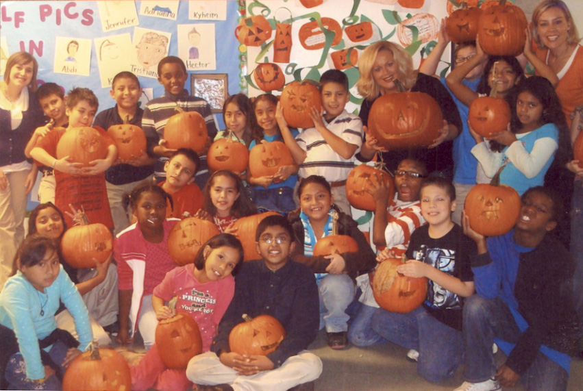 Ms. Zenk's 4th grade class, Anderson Elementary, Minnecapolis, and their Downing Farm pumpkins (2009).