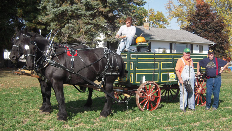A few years back, Vern and his brother Harlan (at far right) rebuilt a 1917 John Deere wagon. On August 29, 2012, Vern's friend Pam Hinze brought over her team of Percherons and hooked them up! Quite a crowd of neighbors gathered to see, and a few brave souls even took a ride in the wagon!